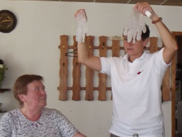 Erster Hinweis von Frau Springsguth: Man solle, auch zum Eigenschutz bei der Ersten Hilfe und bei Wundversorgungen an anderen Personen immer Handschuhe (Einweghandschuhe) tragen.