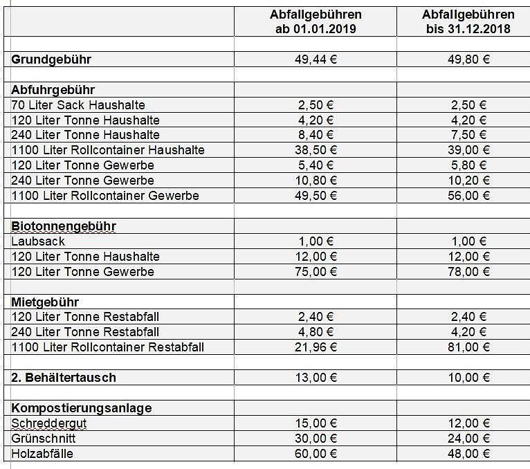 Die Abfallgebühren sind nach den gesetzlichen Vorgaben in regelmäßigen Abständen zu kalkulieren und so zu bemessen, dass sie die erforderlichen Kosten für die öffentliche Abfallentsorgung im Kyffhäuserkreis decken. In der vorgelegten neuen Abfallgebührensatzung wurden die Abfallgebühren für den Zeitraum 01.01.2019 bis 31.12.2022 neu kalkuliert. Im Ergebnis der Kalkulation ist eine moderate Senkung der Abfallgebühren wie folgt zu verzeichnen.