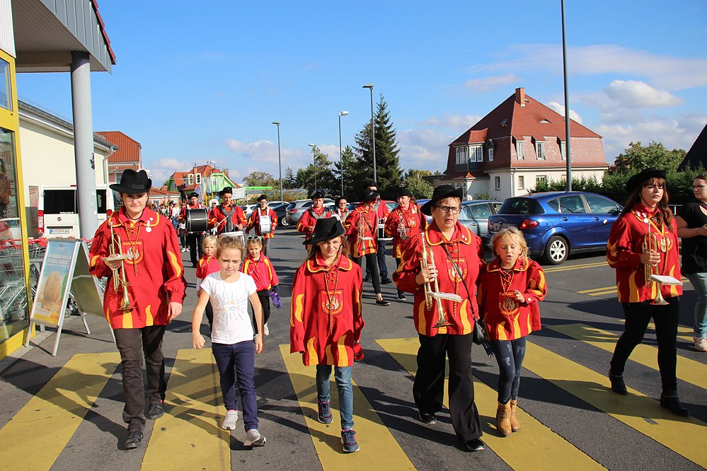 Nach diesem Vorgeplänkel auf dem Markt setzte sich der Zug, angeführt von Polizei und dem Frankenhäuser Fanfarenzug in Bewegung in Richtung zum REWE -Markt und zur nächsten Gaststätte Zur Quelle.