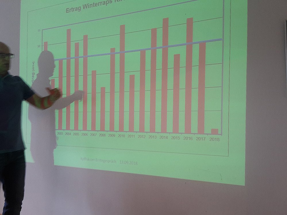 Gerade diese Folie zeigte, wie selbst auf den kleinen Versuchsflächen die Erträge gegenüber dem langjährigen Mittel eingegrochen sind. Der kleine Balken rechts das Ergebnis von diesem Jahr.