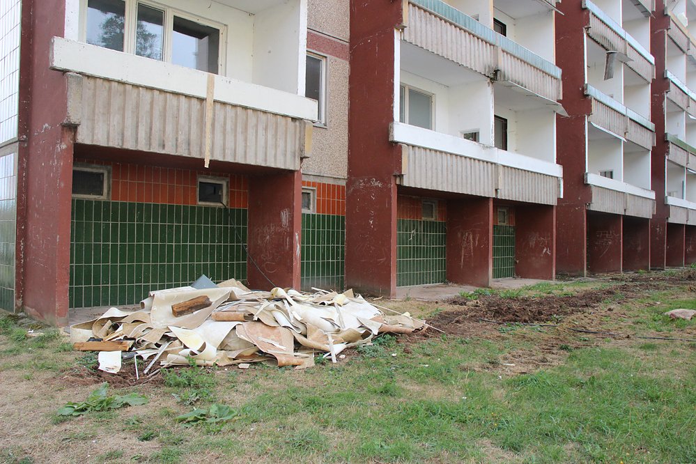 Der eigentliche Abriss hat noch nicht äußerlich sichtbar begonnen, aber man merkt an den Geräuschen der Preßlufthämmer, dem Bau geht es an den Kragen. Der Block wird entkernt.