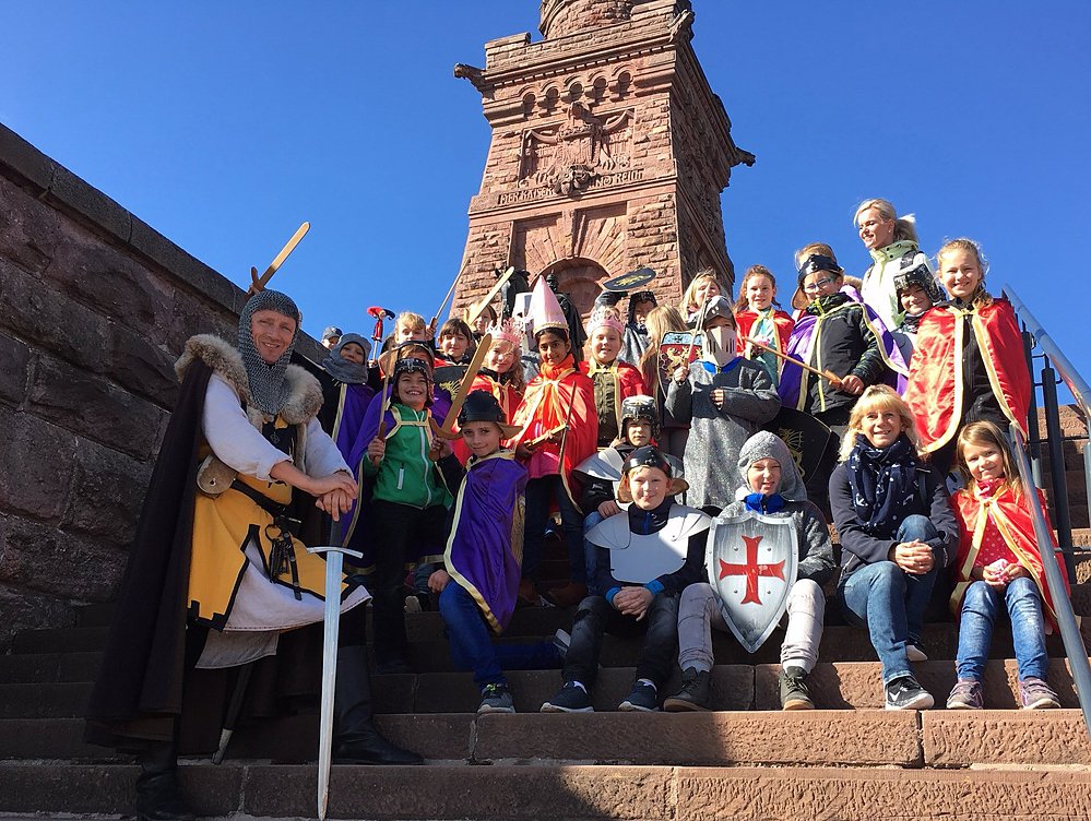 Es ging selbstverständlich zum Kyffhäuser-Denkmal. Dort wurden alle bereits vom Ritter Gerwig von Kyffhausen an der Kasse begrüßt und in Empfang genommen. Nach einer kurzen geschichtlichen Erklärung ging es bereits in die Kleiderkammer. Hier wurden die 24 Mädchen und Jungen zum Burgfräulein, Hofdame oder Königin sowie zum Ritter, Knecht oder Knappen eingekleidet.