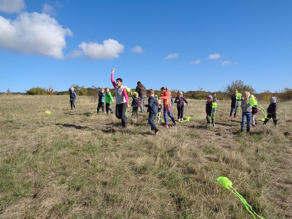 Auf der Wiese konnte jeder nach Herzenslust eine Pause einlegen: entweder mit anregenden Gesprächen oder beim Drachensteigen, denn jedes Kind bekam, von Niklas seinem Papas Arbeitsteam, einen Taschendrachen geschenkt. Auch ohne Wind hatten die Kinder viel Spaß und brachten die leuchtend kleinen Drachen zum Flatterten.