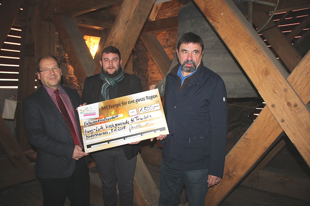Das Engagement der Sondershäuser Bürgerinnen und Bürger für das Glockenprojekt ist beeindruckend. Da mussten wir uns als lokaler Versorger mit einer Spende (*) beteiligen.Schmidt weiter: Wir wünschen der Kirchgemeinde alles Gute und viel Erfolg bei der Realisierung des Projektes und hoffen, dass im Juni 2020, anlässlich des 400jährigen Jubiläums der Weihe der Kirche, das vollständige Geläut in Sondershausen ertönen wird.