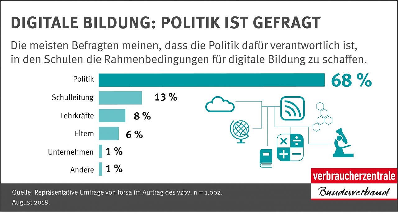 Schulen sind nicht ausreichend auf die Vermittlung digitaler Bildung vorbereitet – das meinen drei von vier Menschen in Deutschland. Die Befragten sehen die Politik in der Pflicht, für die richtigen Rahmenbedingungen zu sorgen, wie eine Umfrage von forsa im Auftrag des Verbraucherzentrale Bundesverbands (vzbv) zeigt...