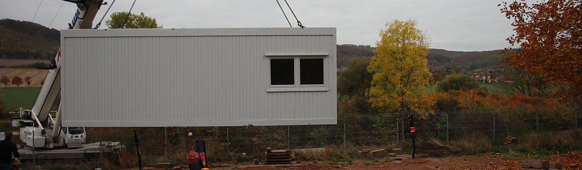 Beim Absetzen der Container auf den vorgesehenen Standplätzen mussten auch die Versorgungsleitungen durch eine recht kleine Öffnung am Boden des Containers eingefädelt werden.
