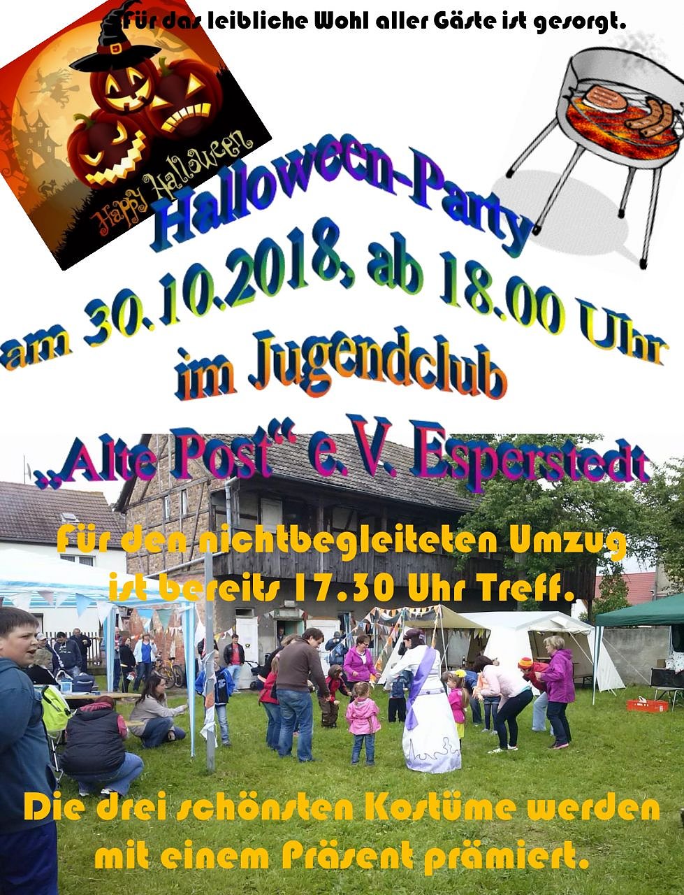 Am 30.10.2018 gibt es in Esperstedt eine große Party. Los geht es ab 18:00 Uhr.