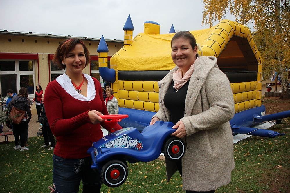 Die Leiterin der Einrichtung Jana Bauer, hier mit DJ Alex der für die musikalische Stimmung sorgte, freute sich über den großen Zuspruch der Besucher, die selbst zu einem Freitagnachmittag zu dieser Kinderkirmes kamen.