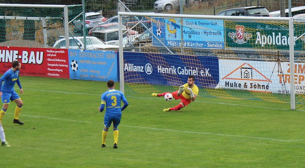 Hier wurde gehalten und in der 40. Minute landete der Ball am Pfosten des Tors von Martinroda. Die Gäste waren zwar spielerisch dem BSV leicht überlegen, aber die klareren Chancen hatte der BSV. Wer aber so viele Chancen vergibt, muss sich nicht wundern, wenn es schief geht.