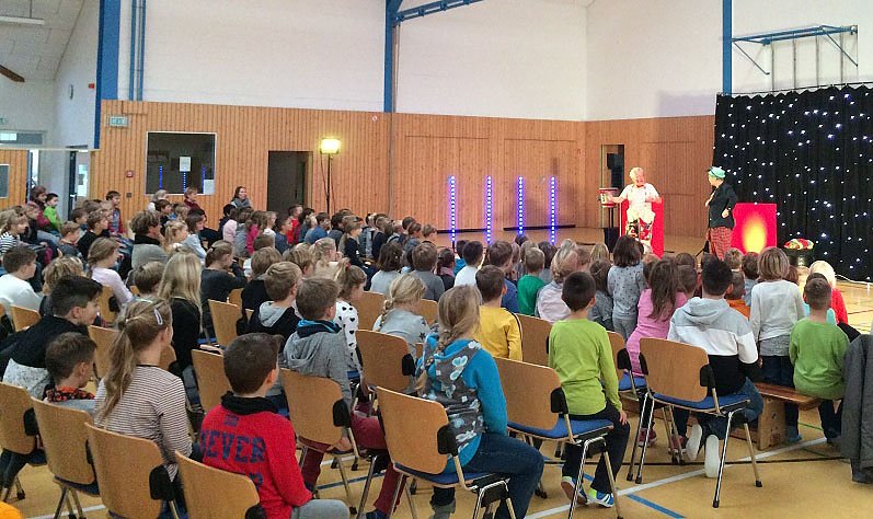 Denn die rund 190 Kinder Schülerinnen und Schlüer der ersten bis vierten Klasse der Grundschule Bottendorf schienen recht müde zu sein, meinte zumindest Clown Hajo. Und so wurde zur Aufwärmung erst mal das Lied mit Theo, Theo zum Muntermachen und Mitmachen gespielt. Das begeisterte so, dass selbst die Erzieherinnen mitmachten. So nochmals richtig in Fahrt gebracht, konnte man sich spielerisch dem Hauptthema widmen.