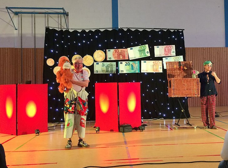 In einer spielerischen Weise bekamen die Kinder etwas über Geld und den Umgang mit Geld vermittelt. So stellten Eurosita (die Sparmaus die bei der Sparkasse arbeitet) und Kater Centrino zusammen mit dem Clown Hajo die Geldscheine vor.