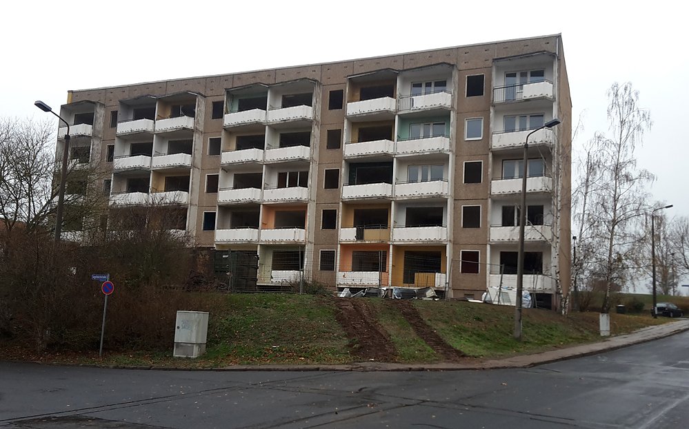 Und der Vorteil bei Abriss, hier stehen noch Fördermittel des Freistaat Thüringen bereit, was die Kosten für die Genossenschaft senkt. Zurzeit läuft die Entkernung des Wohnblocks, weshalb man außen noch nicht so viel sieht.
