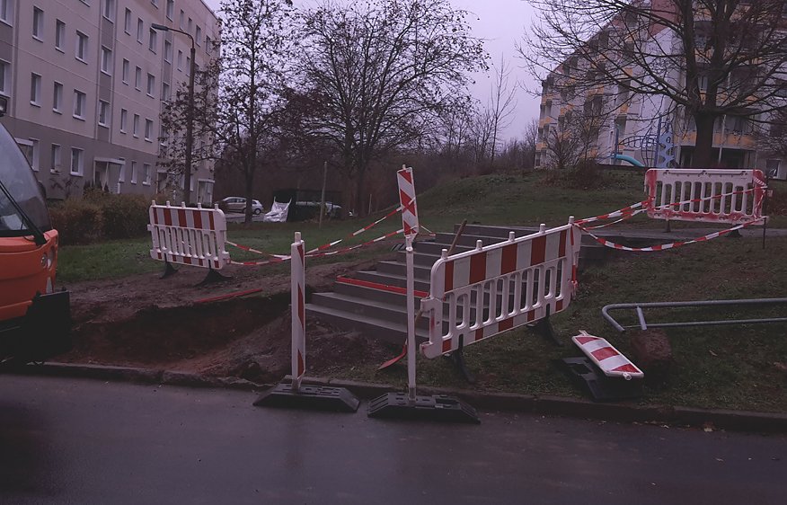 Aber es leben trotzdem noch eine ganze Menge Bürger dort oben und so wird zurzeit die Fußgängertreppe unterhalb des ehemaligen Heizhauses durch den Bauhof saniert.