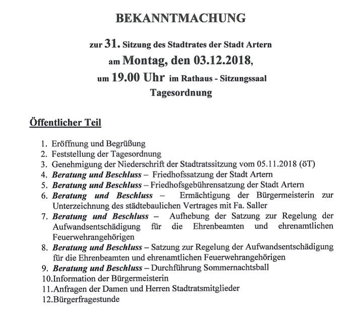 Am Montag den 03.12.2018 wird der Stadtrat von Artern tagen: