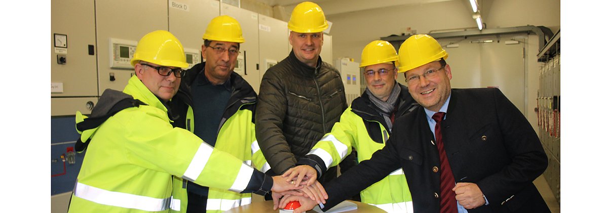 Nach den Erläuterungen nahmen Bürgermeister Steffen Grimm, Geschäftsführer der Stadtwerke Sondershausen GmbH Hans-Christoph Schmidt, Geschäftsführer der Stadtwerke Sondershausen Netz GmbH Hagen Dietsch und Prokurist der Stadtwerke Sondershausen Netz GmbH Andreas Grabe sowie Frank Steinhoff Meister Stromnetz der Stadtwerke Sondershausen Netz GmbH gemeinsam symbolisch die Spannungsanhebung vor.