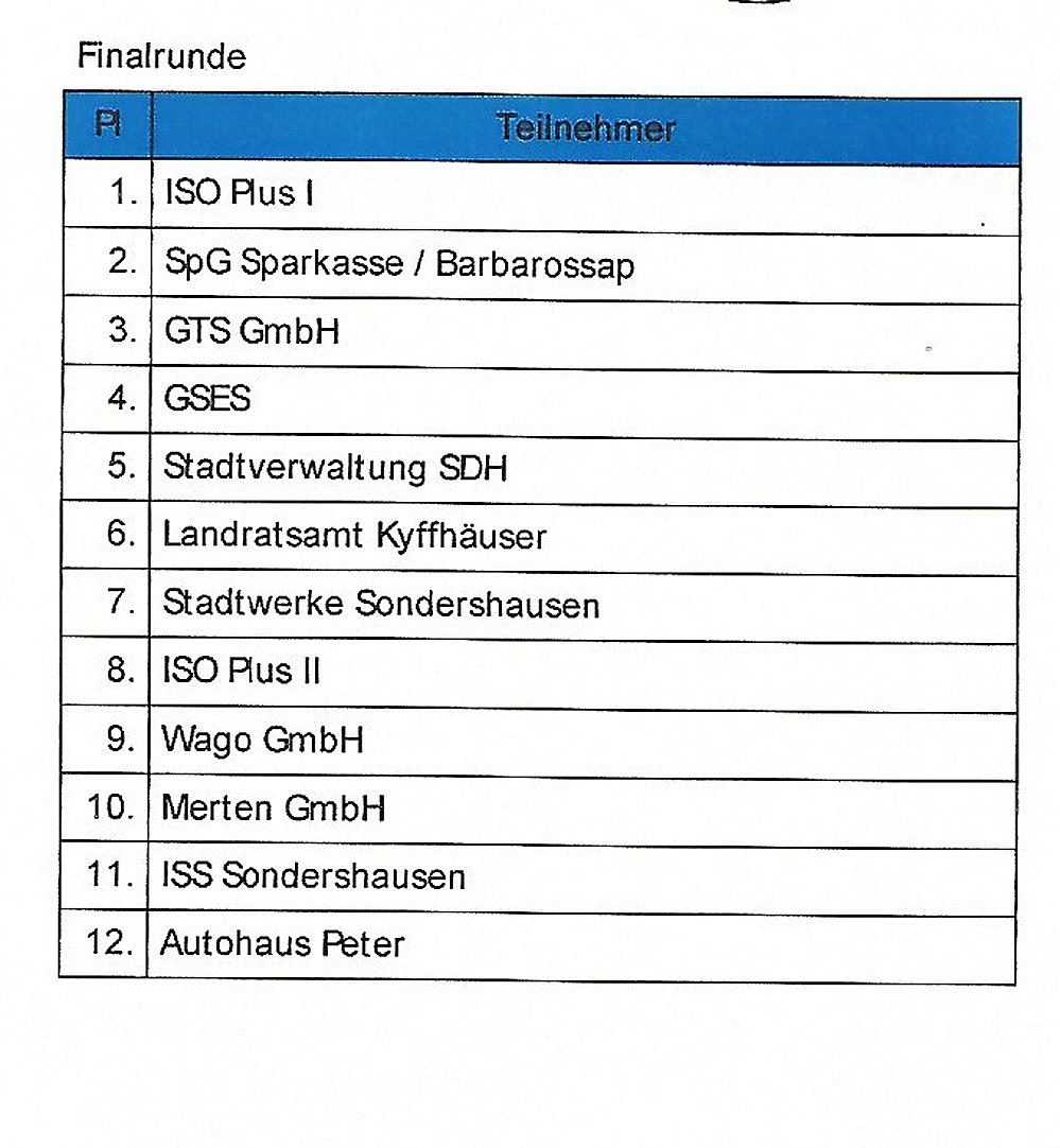 Im zweiten Halbfinale setzte sich die Spg. Kyffhäusersparkasse / Barbarossaplan knapp mit 2:1 gegen die GTS GmbH durch.