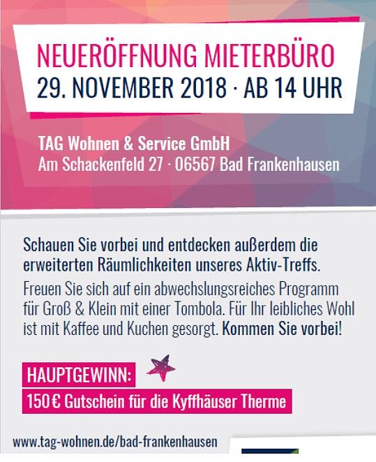 Mit einer Tombola wird die TAG Wohnen gemeinsam mit ihren Mietern und Interessierten die neuen Räumlichkeiten am 29. November 2018 ab 14 Uhr eröffnen. Kleine Überraschungen wird es während der Eröffnung geben, schließlich beginnt bald die geheimnisvolle Weihnachtszeit.