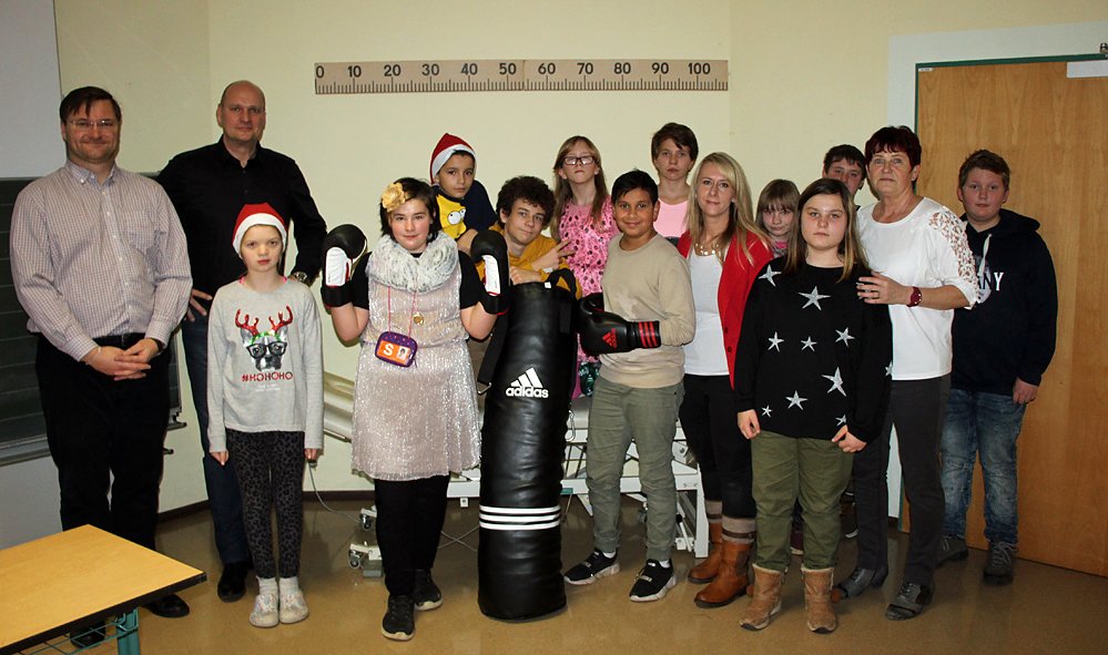 Martina Franke, dienstälteste Lehrerin, wie sie selbst spaßig sagte, vertrat die komplett erkrankte Schulleitung. Beim Boxen am Sandsack bewegen sich die Kinder und können so auch mal Dampf ablassen. Und Spaß machte es, wie die Kinder beim ersten Versuchen sagten. Allerdings muss der Sandsack erst noch sicher aufgehangen werden.