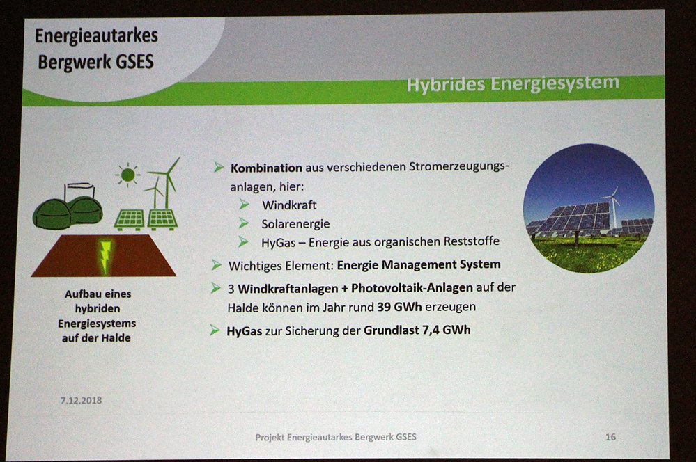 Bei der Windkraft wird es nicht bleiben. Mit einem Energie Management System soll bei einem Mix mit Windkraft, Solar und Energie aus organischen Reststoffen (HyGas) die Energieversorgung der GSES gesichert werden.