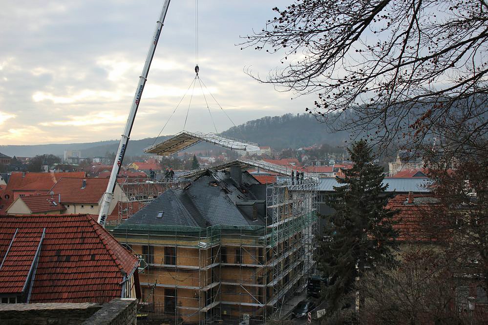 Autor: khhGrund für diese Reaktionen war das Aufsetzen eines Behelfsdachs auf die Alte Post von Sondershausen, damit nicht Regen und möglicher Schnee die Bauarbeiten stört.