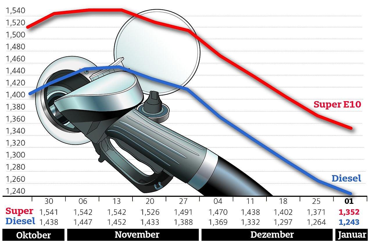 Super E10 kostete im vergangenen Jahr durchschnittlich 1,428 Euro und damit 8,1 Cent mehr als 2017. Damals lag der Mittelpreis bei 1,347 Euro, 2016 bei 1,281 Euro. Noch stärker kletterte der Dieselpreis, nämlich von 1,078 Euro im Jahr 2016 auf 1,161 Euro 2017 und 1,283 Euro 2018. Das ist eine Verteuerung um 12,2 Cent gegenüber 2017 und 20,5 Cent gegenüber 2016.