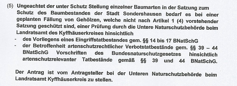 In der 1. Änderungssatzung zur Satzung zum Schutz des Baumbestandes der Stadt Sondershausen wurden die bisher unter Schutz gestellten Nadelbäume ab 100 cm Stammumfang herausgenommen. Der Eigentümer des Baumes muss damit keine Baumfällgenehmigung bei der Stadt Sondershausen einreichen. Die
