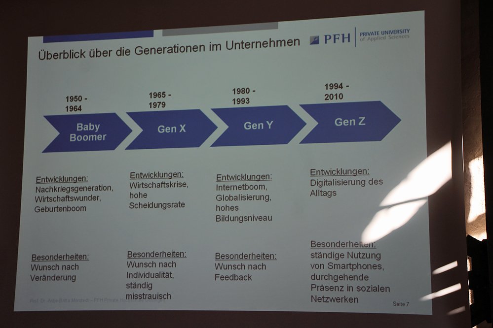 Das hielt sie für wichtig: Wie nehme ich die jungen Leute ins Unternehmen. An Hand einer Folien zeigte sie, die Generationen Baby Boomer bis zur Generation Z und analysiert das Ganze.