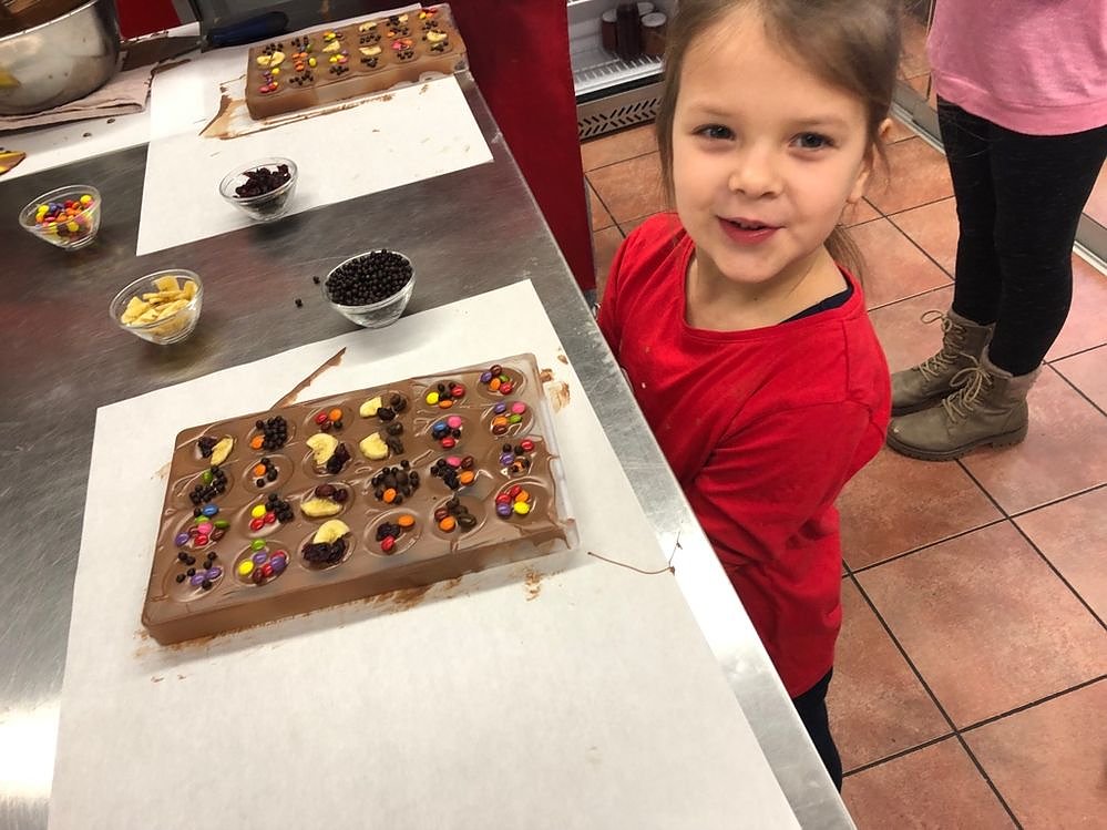 Zu Beginn musste die flüssige Schokoladenmasse in die vorgesehene Pralinenform gegossen und mit leckeren Smarties, Kaffeebohnen, getrockneten Bananenchips, Cranberrys und anderen Zutaten verziert werden. Jetzt musste alles im Kühlschrank fest werden. Um die Zwischenzeit zu überbrücken, konnten die Kids sich auf dem Spielplatz austoben.