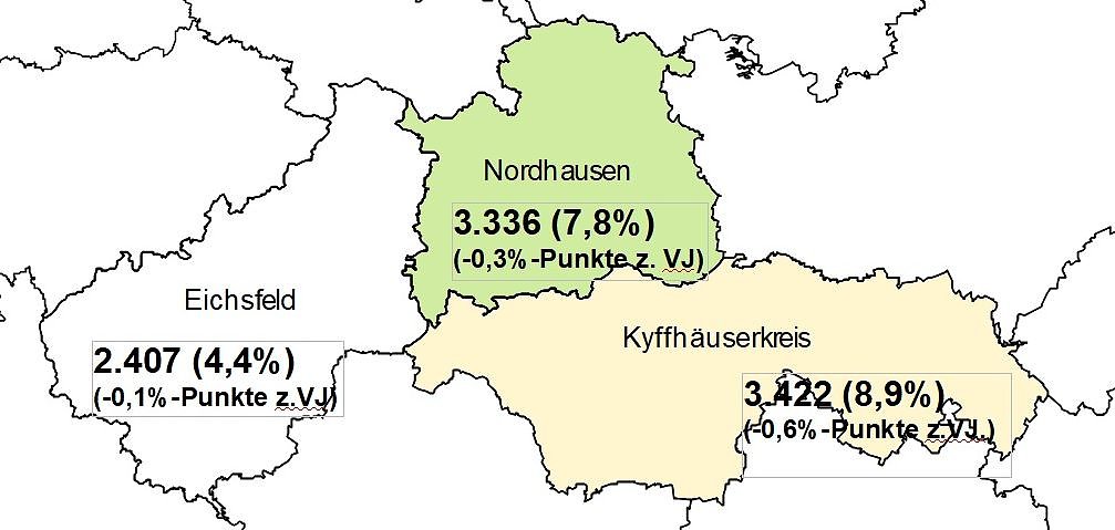 Den höchsten Rückgang der Arbeitslosigkeit in Nordthüringen gab es im Kyffhäuserkreis. Hier ging die Zahl der Arbeitslosen zum Vorjahr um fast acht Prozent zurück. 3.422 Menschen suchen eine Beschäftigung, 130 weniger als im letzten Monat. Die Quote liegt bei 8,9 Prozent. Vor einem Jahr betrug sie 9,5 Prozent.