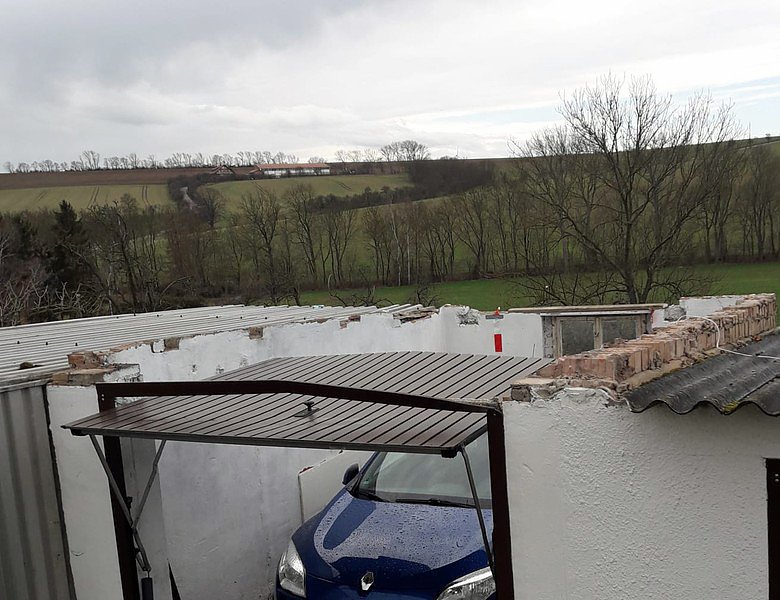 Eine Windböe riss das Blechdach einer Garage aus seinen Verankerungen, welches daraufhin durch die Luft geschleudert wurde und auf der Straße liegen blieb.
