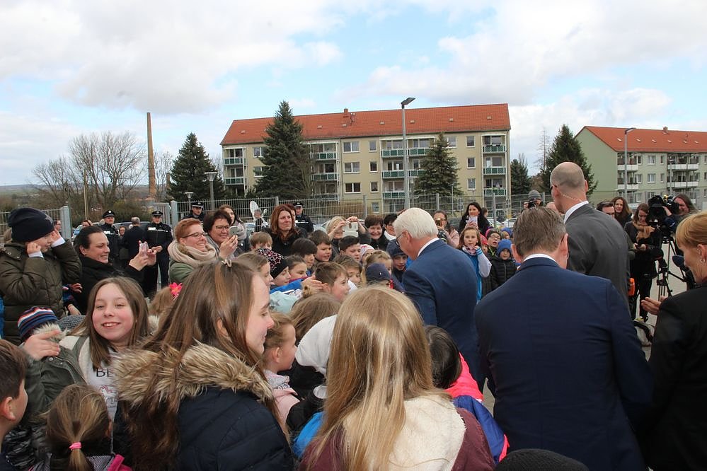 Mit etwas Verspätung kam der Bundespräsident vom Besuch des Unternehmens Schachtbau Nordhausen in Greußen an. Empfangen wurde der Bundespräsident, und mit ihm auf Tour der Ministerpräsidenten Thüringens, Bodo Ramelow (Die Linke), durch Landrätin Antje Hochwind-Schneider (SPD), Greußens Bürgermeister René Hartnauer (SPD) und dem Schulleiter Jürgen Ludwig.