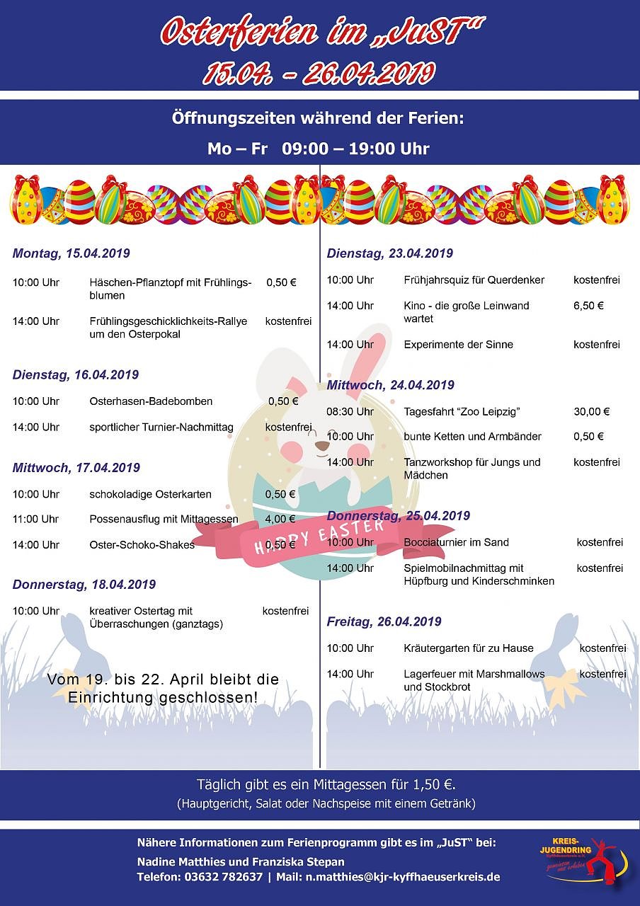Der Jugend- und Schülertreff JuST hat in den Ferien von 09:00 bis 19:00 Uhr geöffnet. Wie in allen Ferien gibt es täglich für 1,50 € ein Mittagessen, mit Vor- oder Nachspeise. Vom 19. bis 22. April, also an den Feiertagen, bleibt die Einrichtung geschlossen.