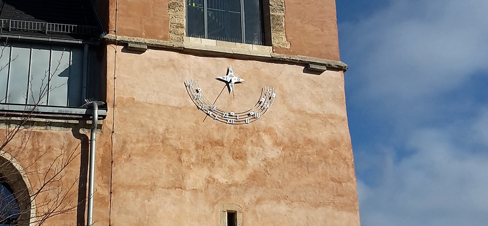 Hier übrigens ein Bild von der Sonnenuhr an der Südseite. Weil gerade der Zeitraum der Tag- und Nachtgleiche ist, und es noch keine Sommerzeit umgestellt ist, zeigte heute um 09:00 Uhr die Sonnenuhr mal wirklich die richtige Zeit an. Das ist im Jahresverlauf nicht immer so, denn mal geht die Sonnenuhr gegenüber unserer Normalzeit mal vor oder nach.