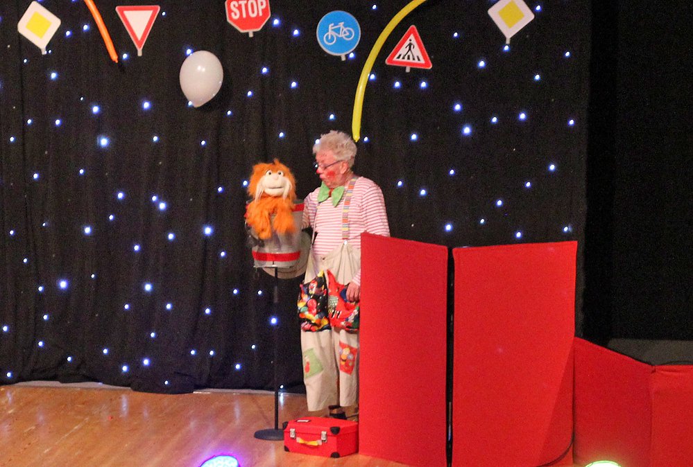 Clown hatte Unterstützung, hier mit Kater Matze, es gab fetzige Musik und lustigsten Lieder im Programm rundeten das Ganze ab. Und so wurde spielerisch erklärt, was man auf dem Weg zur Schule alles beachten muss.