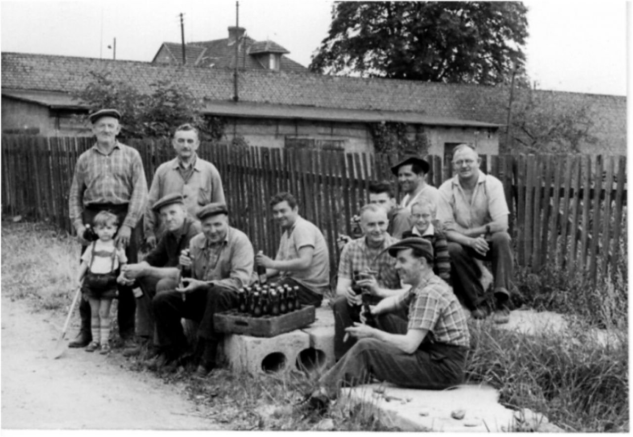 Gehwegbauer 1965 v.l.: Walter Alsleben, Fritz Eggert, Rudolf Scheiter, Hermann Müller, Reiner Kallenbach, Werner Mettin, Dieter Franke, Karl-Ernst Herbst, Titus Kappel, Roland Bauer, Artur Alsleben