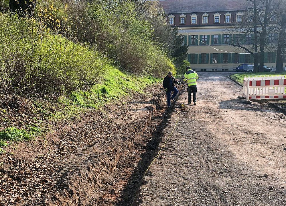 Seit vergangener Woche laufen die Restarbeiten an den Wegedecken im Lustgarten auf Hochtouren. Hier und im Bereich unterhalb des Marstalls wurde im letzten Jahr durch die Stadtwerke Sondershausen eine Fernwärmeleitung verlegt.