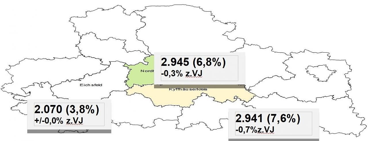 Der Kyffhäuserkreis registrierte mit 2.941 Arbeitslosen die bislang niedrigste Arbeitslosigkeit seit 1990. Um über 300 Personen ging die Zahl der Arbeitslosen zum Vorjahr zurück. Die Arbeitslosenquote beträgt aktuell 7,6 Prozent und ist vergleichbar mit Köln oder Kassel. Vor einem Jahr lag die Quote noch bei 8,3 Prozent. 145 arbeitslose Jugendliche gibt es derzeit im Kyffhäuserkreis, 65 bei der Agentur und 80 beim Jobcenter des Kyffhäuserkreises.