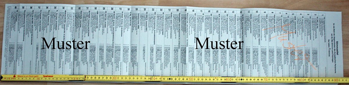 Der Stimmzettel hat die Abmaß von 93 cm x 21 cm und man kann sich mit der einen Stimme bei der Europawahl für eine der 40 Parteien und Wählervereinigungen entscheiden, die für die Wahl zugelassen wurden. Hier mal die Kurzbezeichnungen in der Reihenfolge des Stimmzettels: