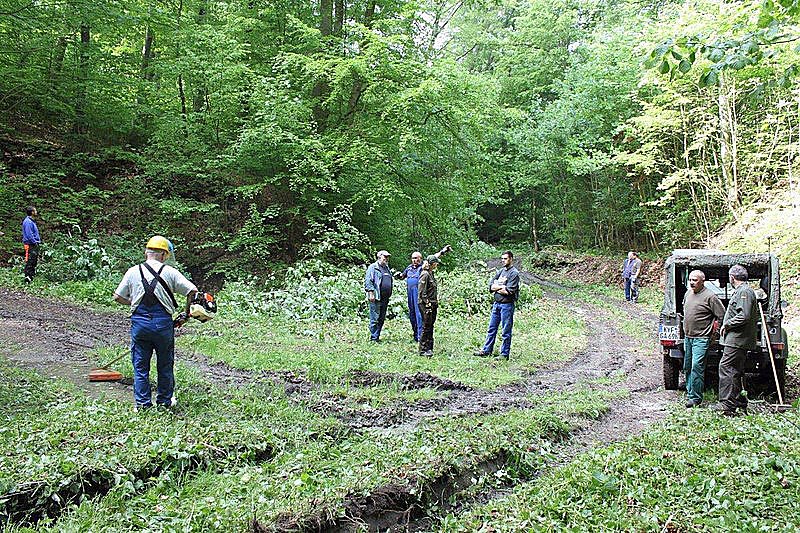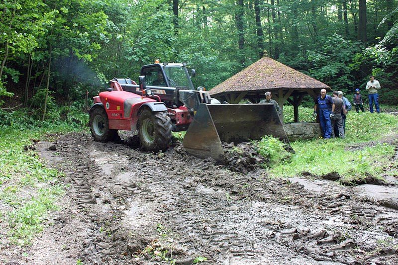 Nach der Unterweisung im Arbeitsschutz und Arbeitssicherheit, wurden die einzelnen Aufgaben und Vorhaben auf die Mitglieder verteilt. Als erstes galt es den Waldweg bis zum Brunnen beidseitig freizuschneiden und durch Auffüllen von Schotter die tiefen Gleise im Waldweg auszubessern.
