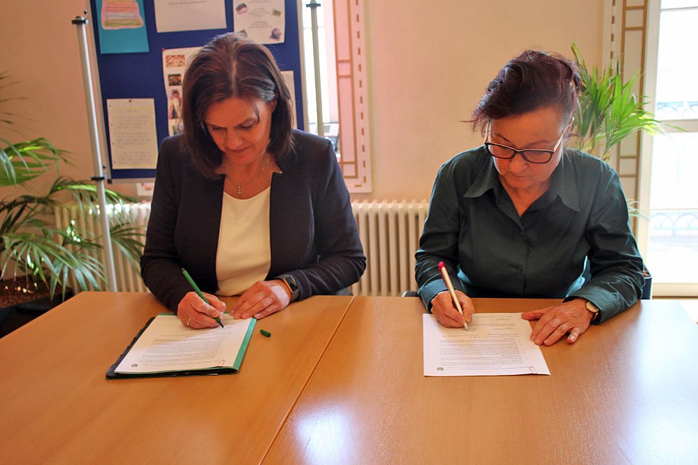 Landrätin Antje Hochwind (li.) und die Geschäftsführerin der Verkehrsgesellschaft Südharz mbH Brigitte Schuchard bei der Unterzeichnung.