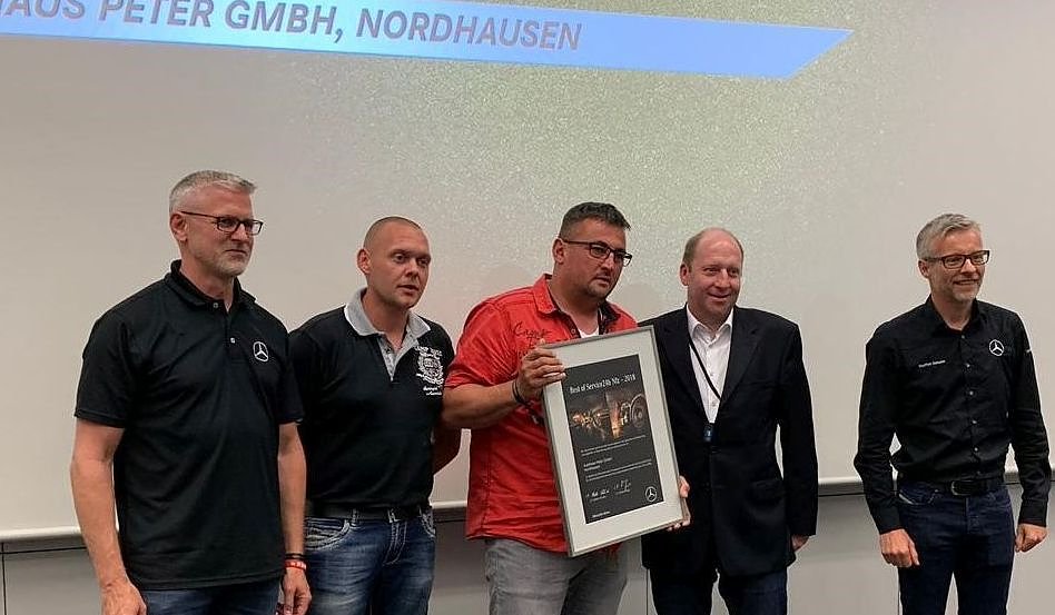 Vertreter der Geschäftsführung von Mercedes-Benz Deutschland übergaben die Urkunden an das Peter-Service-Team (Mitte).