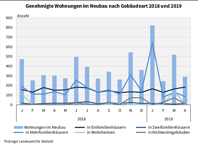 Bis April wurden 937 Wohnungen in Mehrfamilienhäusern geplant, gegenüber dem Vorjahreszeitraum entspricht dies einem Plus von 391 Wohnungen. Die Nachfrage nach neuem Wohnraum in Wohnheimen zeigte ebenfalls eine positive Entwicklung. Es wurden 145 Wohnungen, ein Plus von 36 Wohnungen, genehmigt. 642 Genehmigungen erteilten die Bauaufsichtsbehörden zum Bau eines Einfamilienhauses. Damit wurde ein Plus von 25 Eigenheimen gegenüber den ersten vier Monaten 2018 erreicht. Bei Zweifamilienhäusern zeigte sich seit Jahresbeginn ein Rückgang der Genehmigungszahlen. Bis April wurden 46 Wohnungen geplant, gegenüber dem Vorjahreszeitraum ein Minus von 8 Wohnungen.
