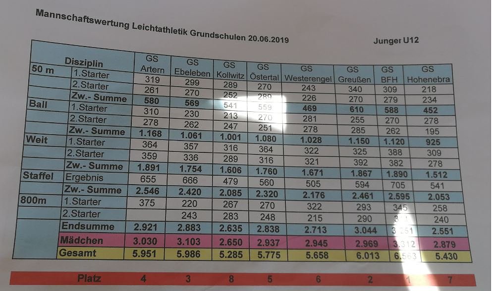 In Auswertung unseres Mannschaftsmehrkampfs/ Kreisjugendspiele Leichtathletik der Grundschulen im Kyffhäuserkreis am Donnerstag, dem 20.06.19 in Bad Frankenhausen gibt es diese Endergebnis der Mannschaftswertung sowie die Aufstellung der Medaillengewinner.