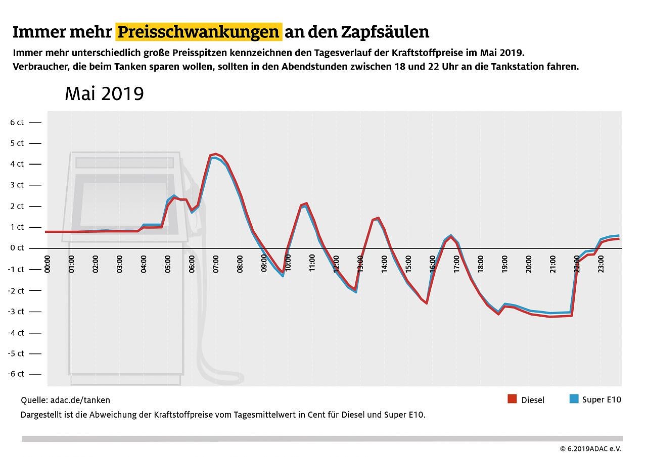 Am günstigsten ist Tanken zwischen 18 und 22 Uhr. Dazwischen sorgen drei Spitzen für zusätzliche Bewegung an den Preistafeln. Damit hat sich die Tagesverlaufskurve im Vergleich zu den Vorjahren erneut verändert, bislang gab es tagsüber nur zwei Preissprünge. Mittlerweile hat sich am Vormittag eine zusätzliche Preiserhöhung durchgesetzt. Basis der aktuellen Untersuchung waren sämtliche Preisbewegungen der gut 14.000 Tankstellen in Deutschland im Mai 2019.