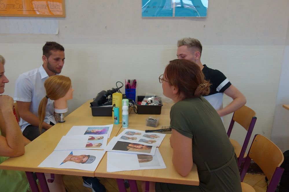 Die Lehrer wollen mit diesem Training auf den Höhepunkt des gesamten Bewerbungstrainings vorbereiten: Das Bewerbungsgespräch mit echten Ausbildern aus der Wirtschaft am Mittwoch. Freundlicherweise werden sie unterstützt durch die beiden Lehrerinnen Frau Sturm und Frau Morgenthal mit 10 Azubis einer Friseurklasse des SBZ Nordhausen, die zeigt, wie man sich dazu richtig stylt.