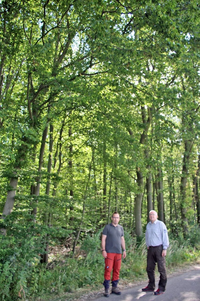 Das es anders geht mit unserem Wald zeigt dieses Bild. In der gleichen Region (Oberholzchaussee nahe der B249). Forstamtsleiter Uli Klüßendorf und Revierförster Mario Busch vor einem Waldstück, der mit Hainbuche (keine Abart der Buche) und Eichen bestandene Wald ist nicht geschädigt. Die Wurzeln dieser Bäume gehen wesentlich tiefer (bis acht Meter) als die der Buche (bis zwei Meter).