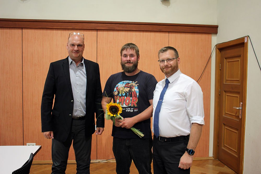 Nach der Verpflichtung: Bürgermeister Steffen Grimm (pl), Tino Reitzig (Freie Wähler) und Stadtratsvorsitzender Daniel Pößel (Freie Wähler).
