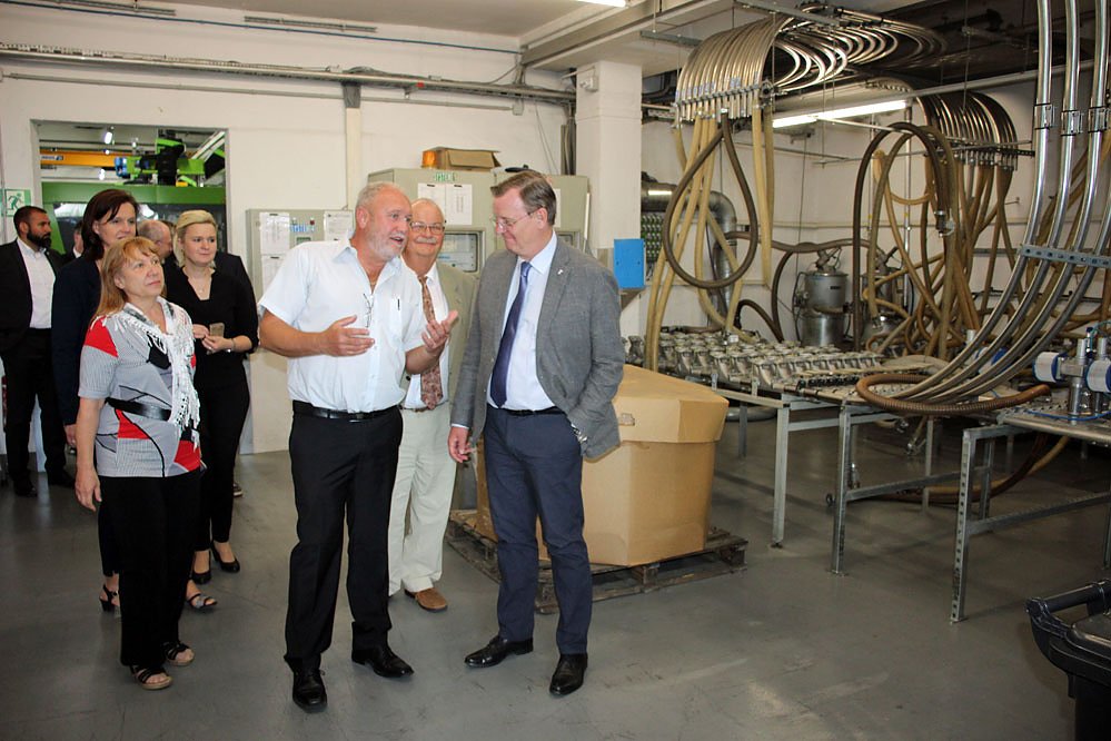 Am Standort in TR Plast Ebeleben in Thüringen steht die Serienproduktion von Mittel- und Großserien von Spritzgußteilen, vor allem für die Autoindustrie im Vordergrund. Bei einem Rundgang im Betrieb erhielt Ramelow (ganz rechts) Informationen von Betriebsleiter Klaus Reizammer.