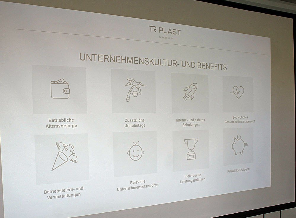 Zuvor hatte die stellvertretende Betriebsleiterin Anja Daniel die bewegte Geschichte des Unternehmensteil TR Plast Ebeleben vorgestellt. Über die Station Sponeta (Produktion von Tarnnetzen) zu DDR-Zeiten erlebte sie die Verkauf durch die Treuhand zur TTB Group bis hin als die TR Plast Neumarkt in der Oberpfalz Ebeleben übernahm.