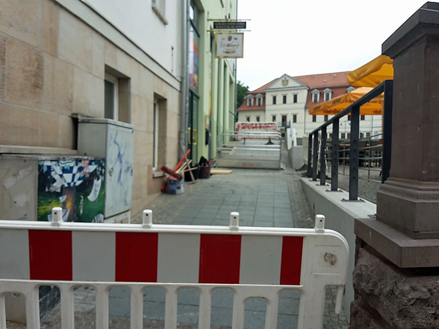 Am Markt ist seit zwei Tagen der kleine Fußweg zwischen Markt und Hauptstraße gesperrt. Für Fußgänger kein Problem, es geht über die daneben liegenden Treppen. Einen Kinderwagen kann man noch mit Hilfe die Treppen hochtragen.